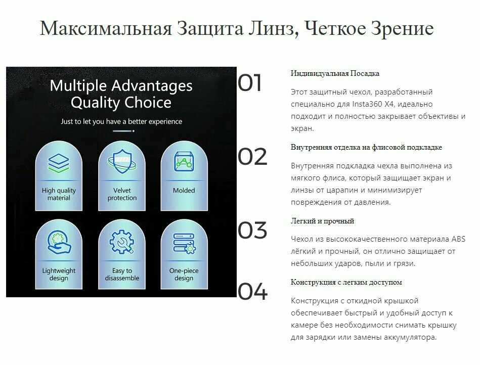Комплектация : | Защитная крышка для экрана и объектива Insta360 X4 |
