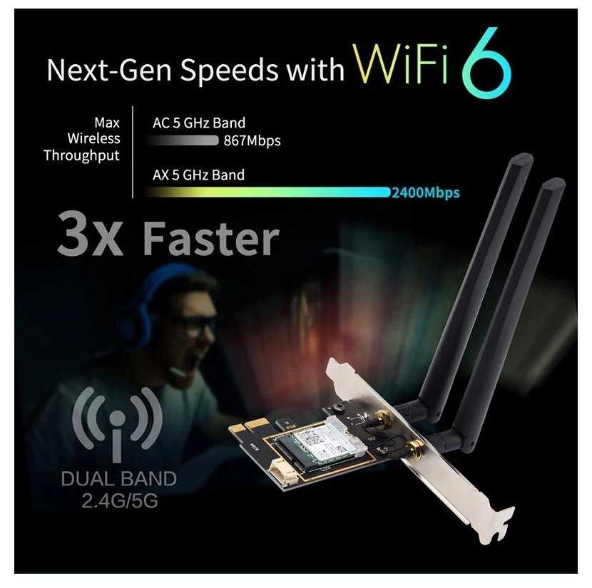 Адаптер поддерживает Wi-Fi 6E (включая новый диапазон 6 ГГц) и Bluetooth 5.2/5.3. Это обеспечивает не только высокие скорости (до 2400 Мбит/с), но и меньшие задержки, что критично для онлайн-игр и видеосвязи. Bluetooth 5.3 обеспечивает быстрое (2-3 секунды) и стабильное подключение беспроводных наушников, мышей и других аксессуаров, а также улучшает качество звука. -