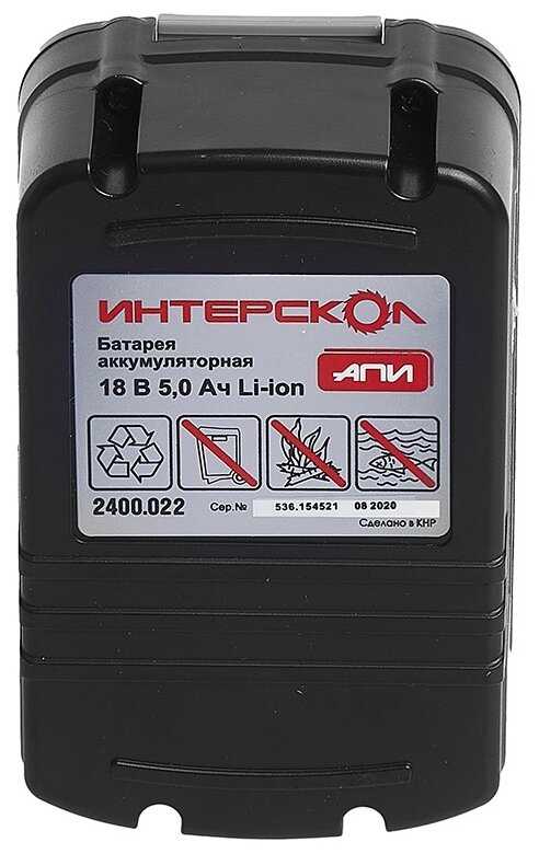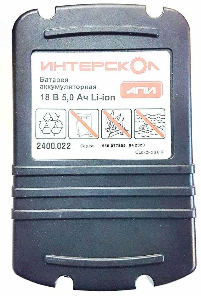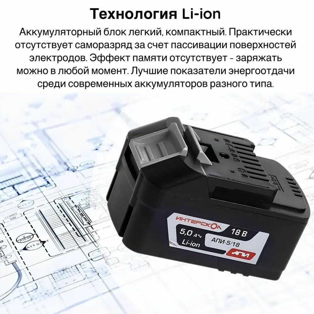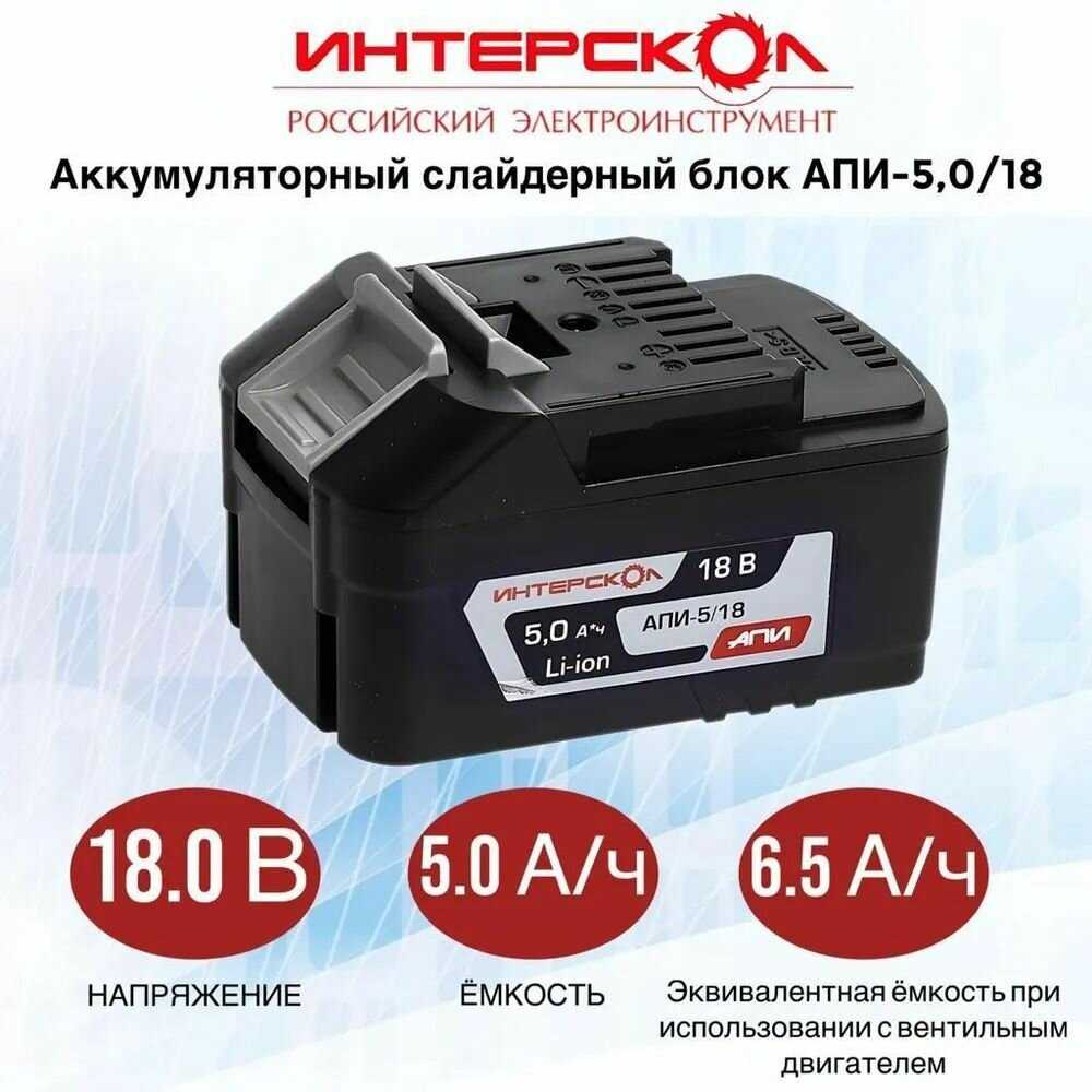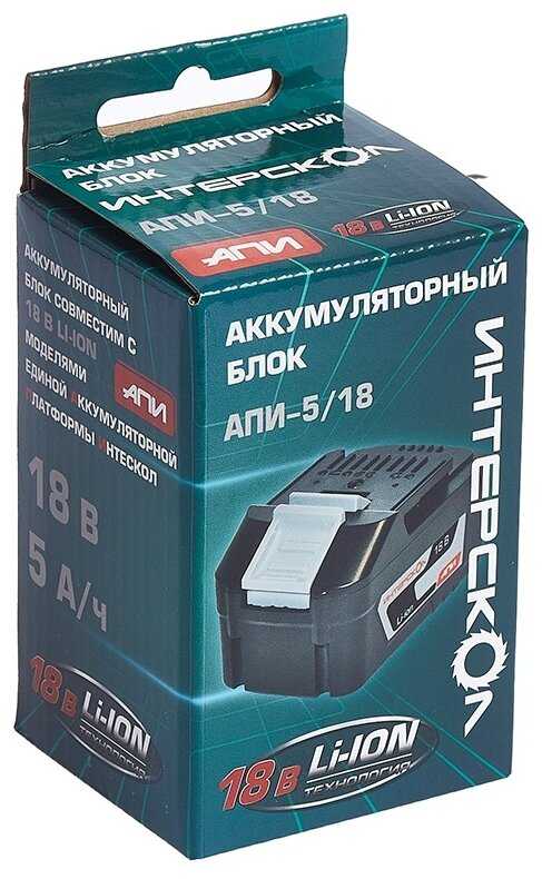 - + 5 а/ч. Подходит для любого 18 вольтового инструмента Интерскол, где используются аккумуляторы АПИ.