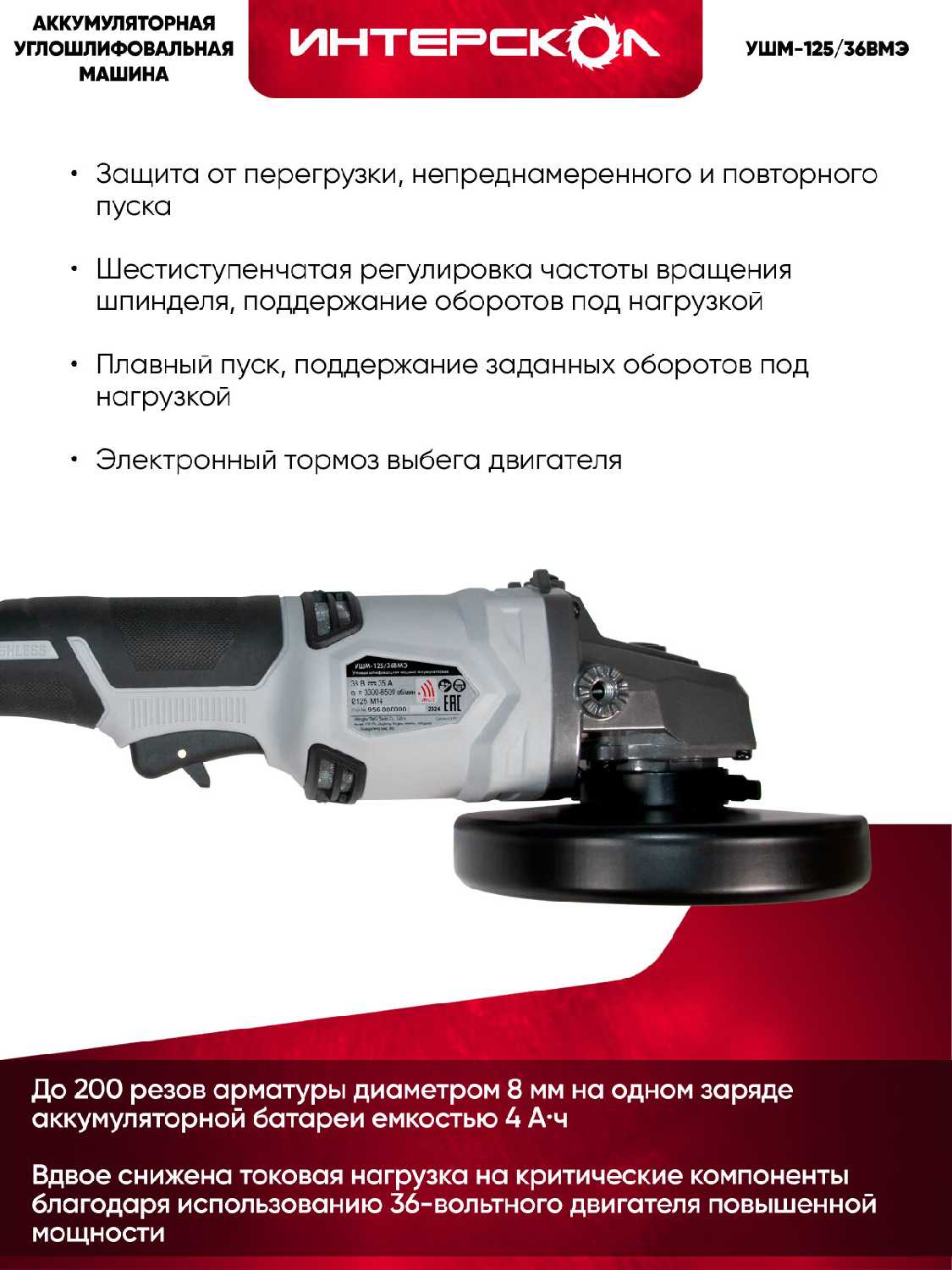 Характеристи Интерскол Бесщеточная аккумуляторная [125 мм] [956.0.0.70]