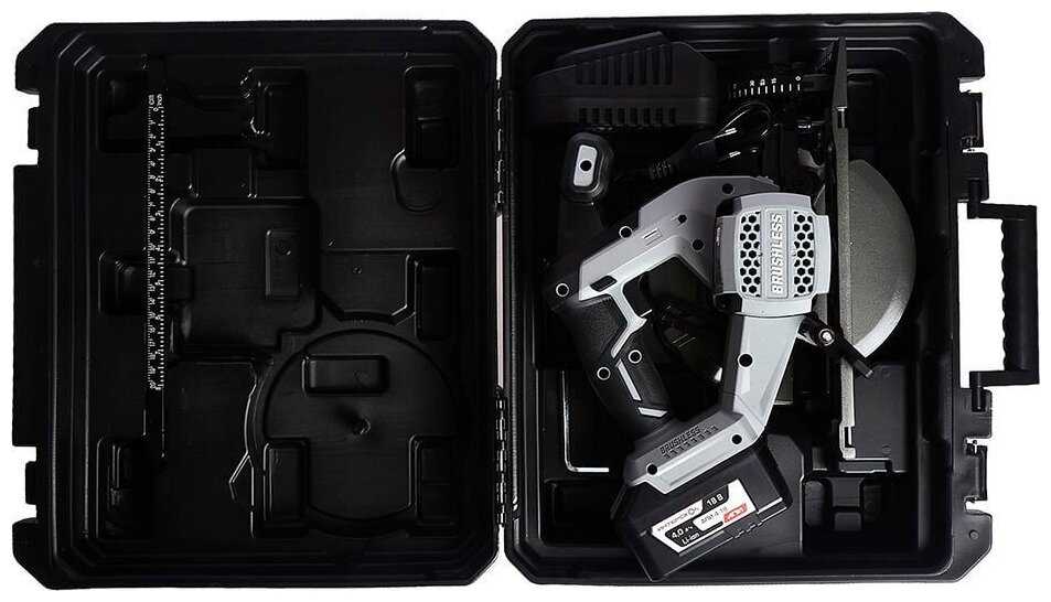 | Комплект поставки : | дисковая пила, пильный диск, направляющая линейка, ключ S6, инструкция, аккумулятор, зарядное устройство, кейс |