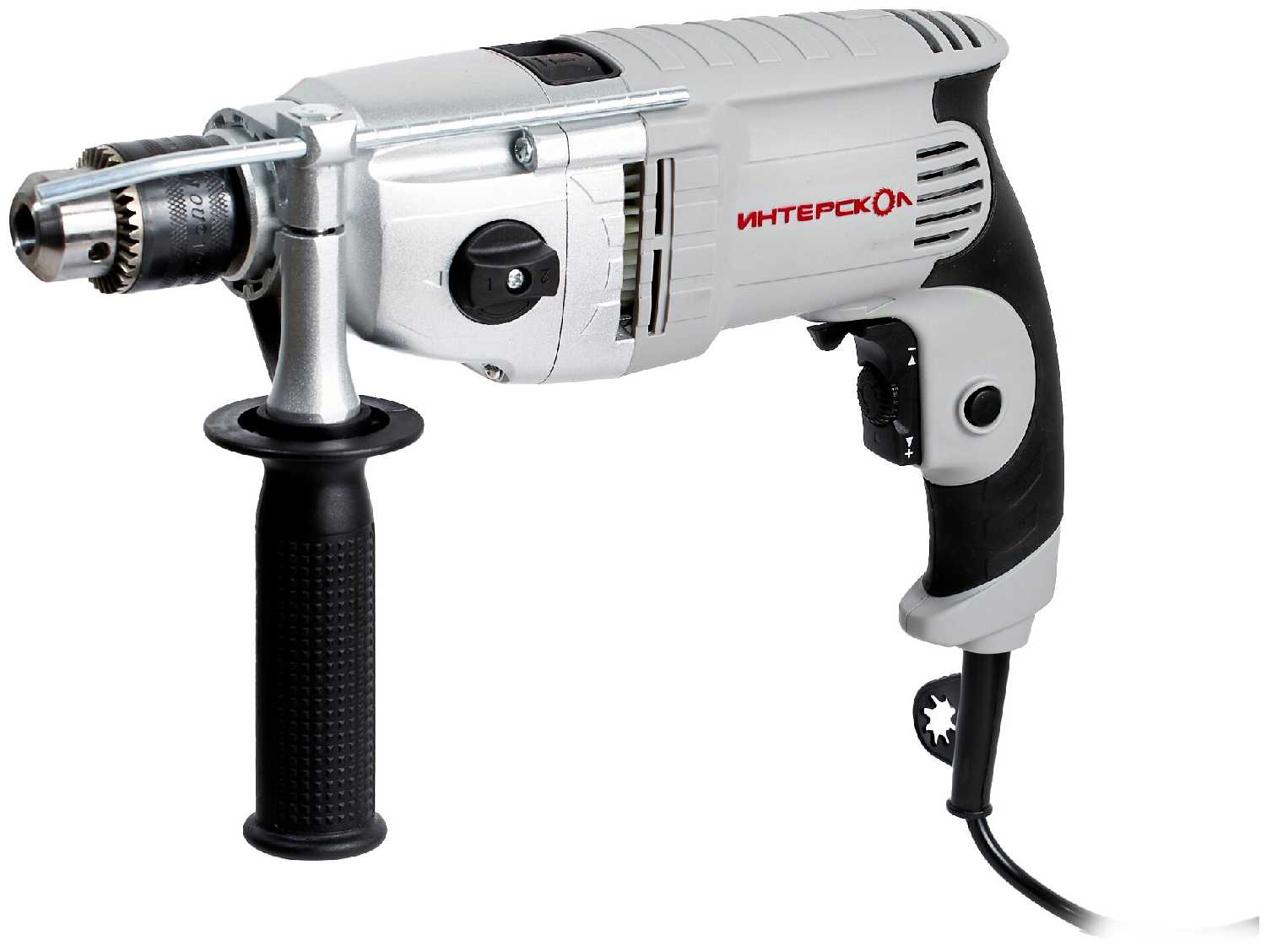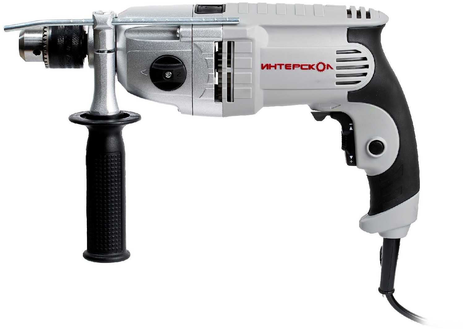 - + Мощная, универсальная, патрон под ключ, шнур длинный