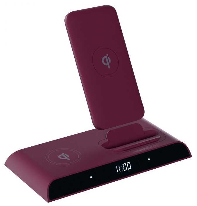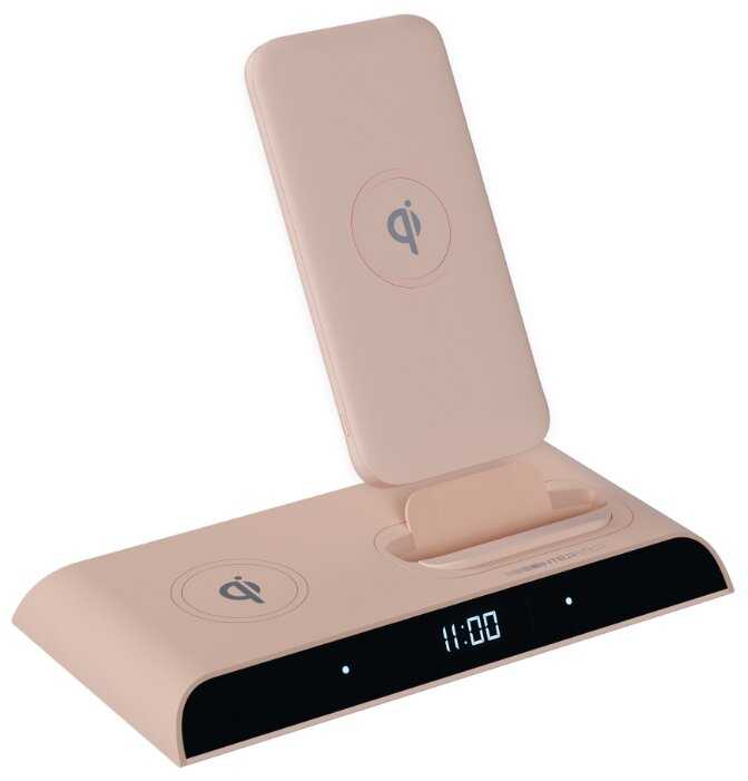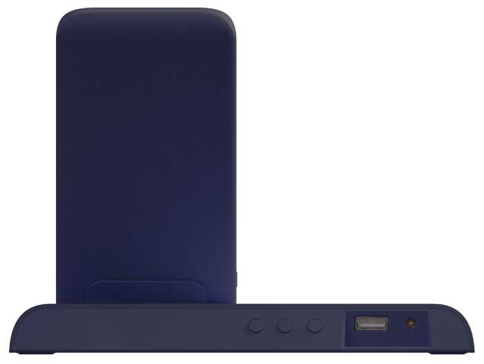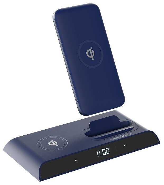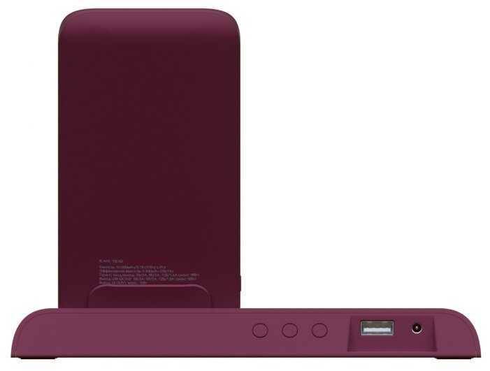 - Внешний вид. Выглядит очень стильно в любом цветовом исполнении. Справа есть индикатор заряда в виде лампочек. На внешней части внешнего аккумулятора прорезиненное кольцо, в центре надпись беспроводной технологии. Смартфон не скользит на банке и держится уверенно. Также стоит отметить покрытие Soft-Tuch, приятное на ощуп и не скользящее в руках. Станция выглядит добротно и на столе дополняет интерьер. На передней части станции дополнительно можно поставить время, будет гореть в виде электронного табло и не надоедать. - - - Покрытие качественное и за год ничего не слазит. Но почему-то в светлом цвете появились различные пятна на углах, которые не отмываются ничем, даже спиртовой жидкостью. На тёмном такого особо не наблюдаю (имеется в наличии синего и розового цветов).