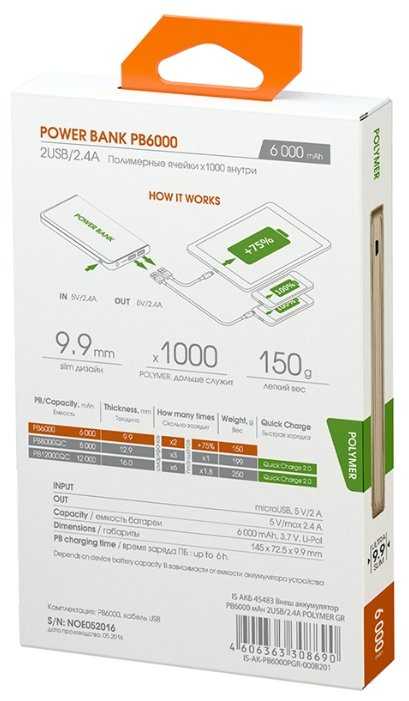 Заявленной ёмкости не соответствует, вместо 6000 мАч, реально около 4500. Телефон с батареей 3000 зарядил один раз полностью, а второй раз на 50%.
