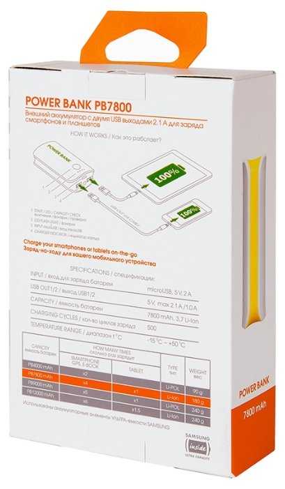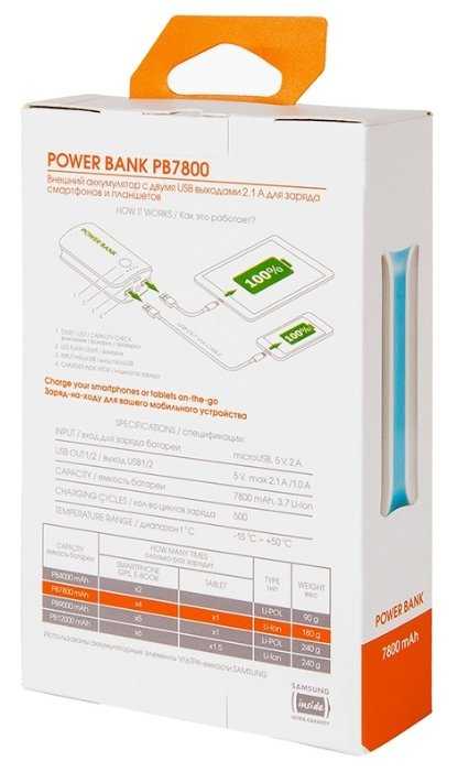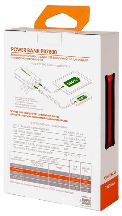 - + Два порта usb, ЖК дисплей, ёмкость составляет 7 800 мАч.