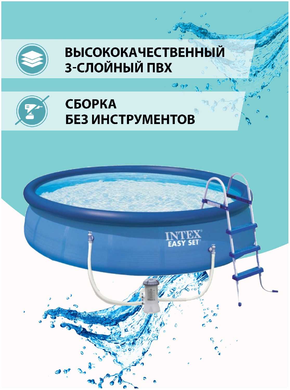 Дополнительная информация : | материал чаши бассейна: 3-х слойный ПВХ, армированный сеткой из полиэстера, комплектация: надувной бассейн Intex Easy Set, фильтр-насос картриджный 220В (3785 л/час), лестница, тент для бассейна, подстилка под бассейн, руководство по эксплуатации |
