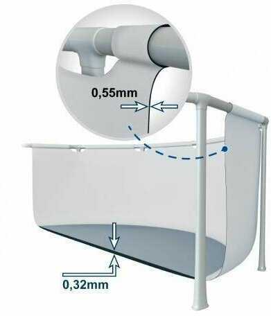 - Высота бортов 1,32 м позволяет детям плавать, доставая до дна (рост от 120 см), а взрослым — комфортно охлаждаться.