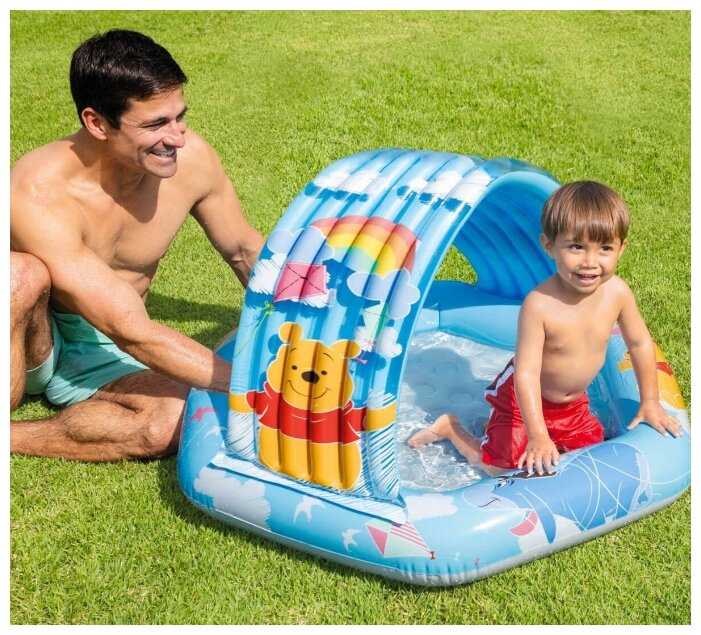 Пока есть жаркая погода адо ловить каждый день с солнышком. Бассейн купили по просьбе детей для внуков. Они совсем еще малыши и их нужно всячески защищать от солнца. Поэтому выбрали модель со специальным тентом, который закрывает голову и плечи от ярких лучей. Принт чркий, качество материала как всегда на высоком уровне, не первый раз покпуаем продукцию производителя. Бассейн с надувным дном можно сразу использовать для массажа стоп, так как поверхность получается рельефная.