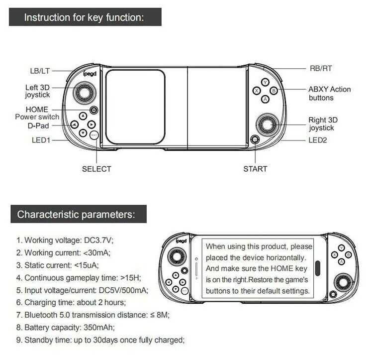 Геймпад покупался для эмуляторов ps2 и psp на андроид. С этой задачей справился прям из коробки при подключении по инструкции (клавиша home+X). Потом решил протестировать в играх на андроид из play market. И ничего... Ни в одной игре не определялся (COD, Pubg и ТД). Я полез в инструкцию, попробовал все возможные режимы подключения (кроме проводного). Ни в одном режиме не определяется в играх на андроид. Далее в ход пошел метод научного тыка. Этим научным методом было выяснено, что геймпад поддерживает режим подключения как беспроводной геймпад xbox. Теперь он определяется в системе как Xbox Wireless Controller. После этого он стал определяться во всех андроид-играх. Для его активации надо зажать home+RB... В инструкции об этом ни слова. Надеюсь, что помогу кому-то этим отзывом и вы не будете перебирать кучу комбинаций. Геймпад однозначно рекомендую, он очень годный и вполне по доступной цене (2499 я его взял)