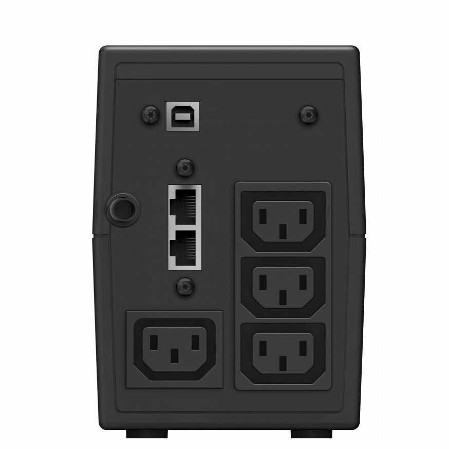 При работе от сети корпус нагревается до 40–45°C из-за компактного трансформатора и активного AVR. Вентиляционные решётки по бокам обеспечивают базовое охлаждение, но при нагрузке свыше 70% (250+ Вт) и температуре среды выше 30°C рекомендуется установка доп. вентилятора. В режиме батареи нагрев усиливается до 50–55°C. Пластик корпуса не деформируется, но выделяет химический запах при первом включении. Три розетки IEC 13-14 с защитой от помех поддерживают батарейное питание, однако разъёмы подвержены люфту – подключённые кабели могут терять контакт при вибрации.