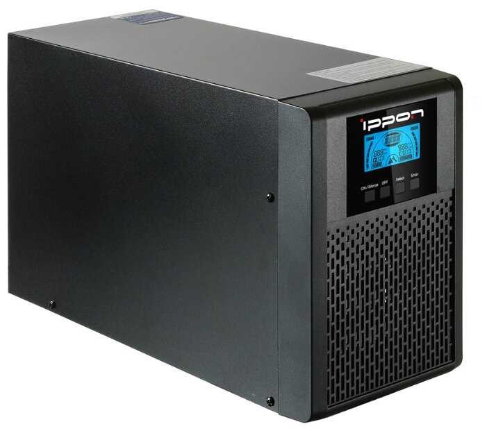 - + Собран по схемы с двойным преобразованием. Есть дисплей, который показывает актуальную информацию о состоянии ИБП.