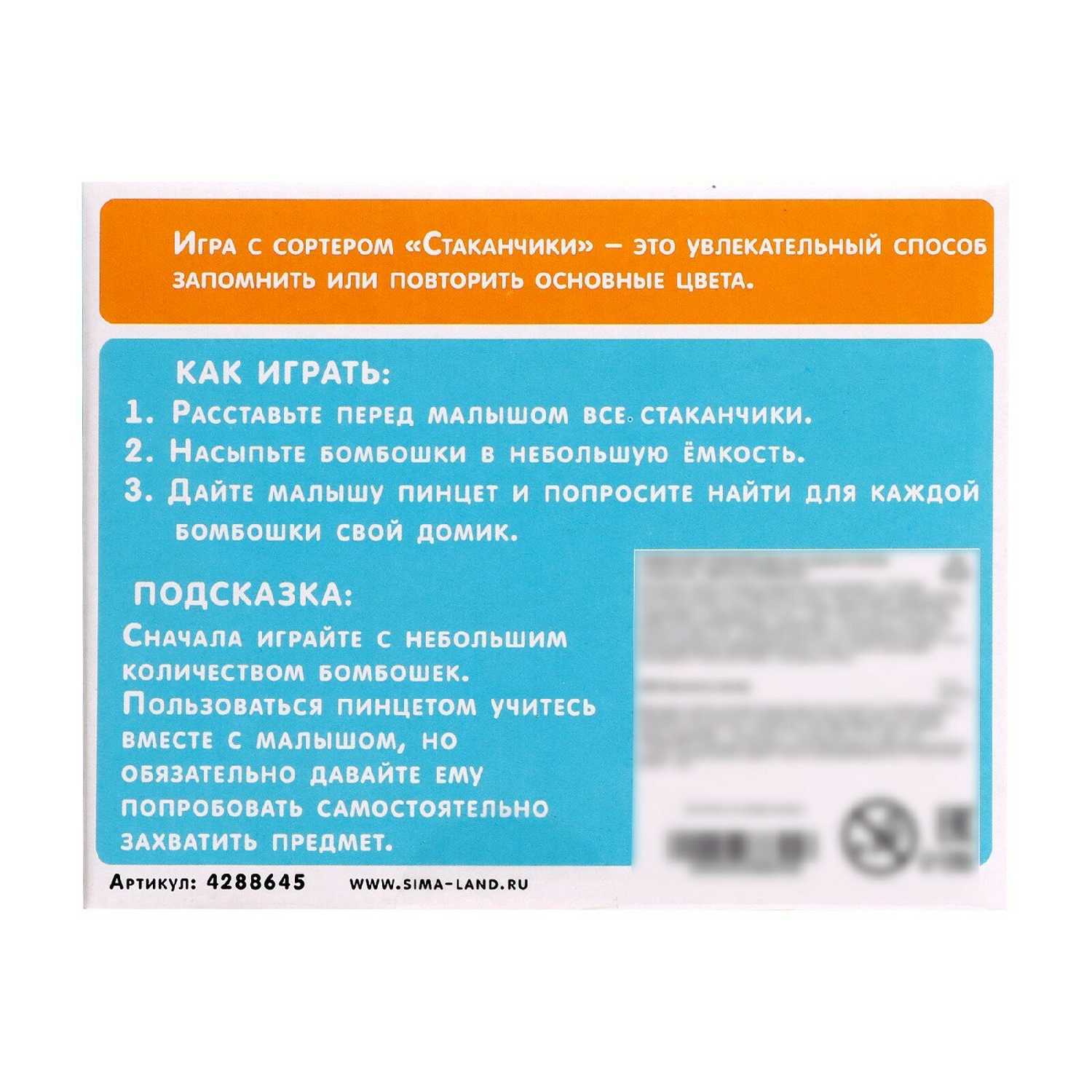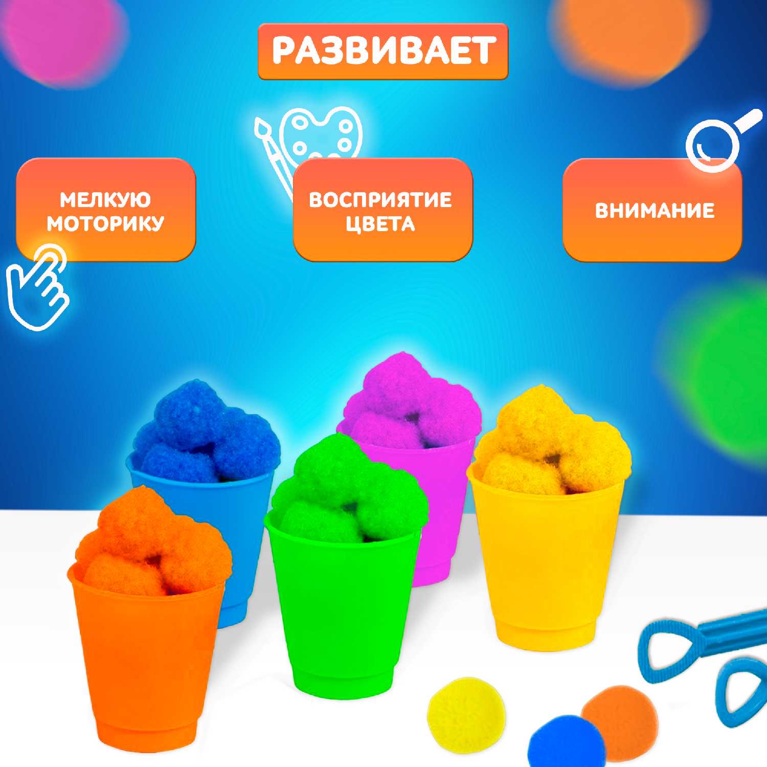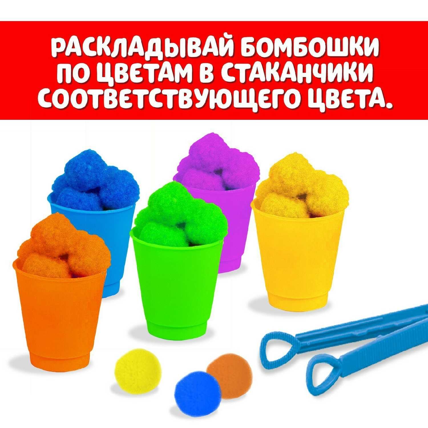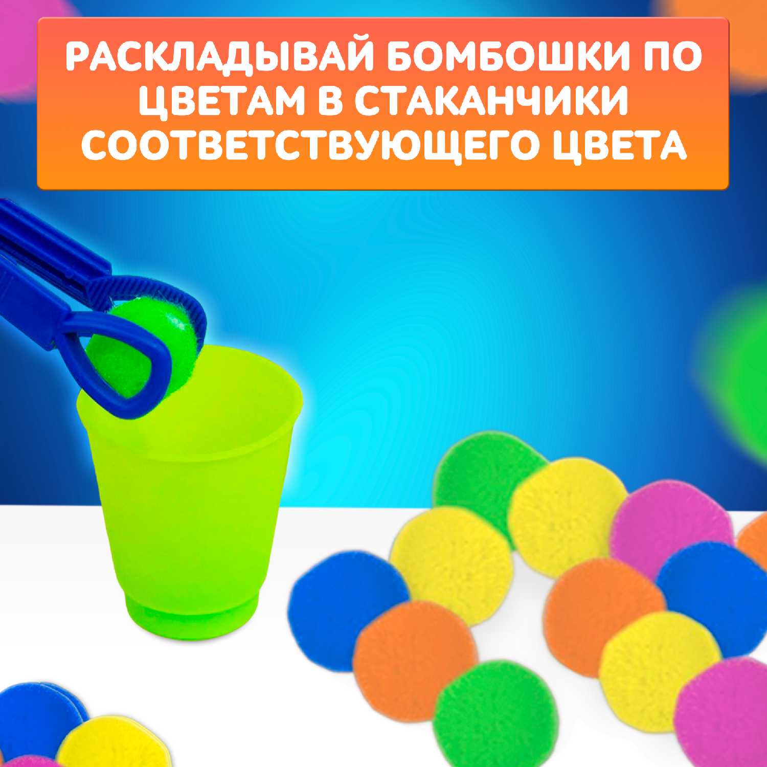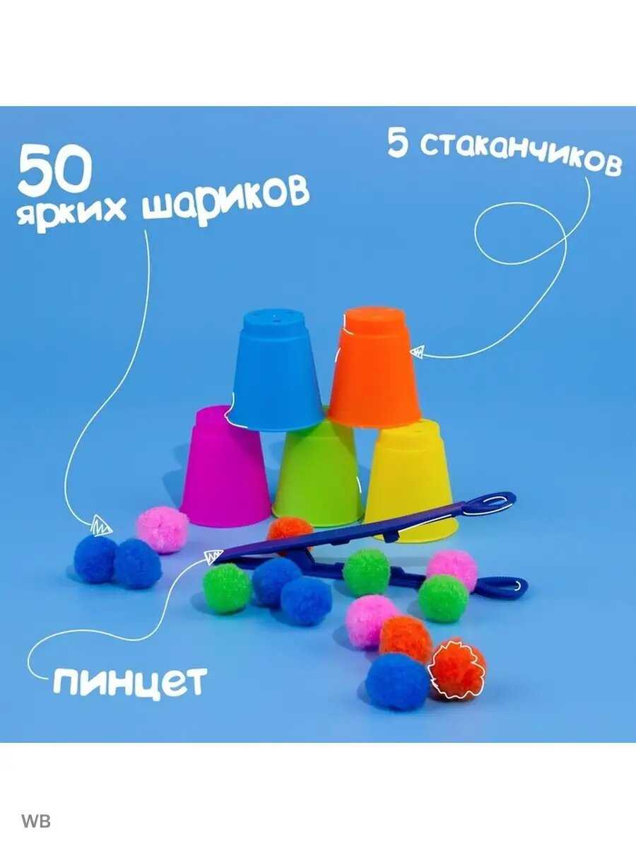 - + хороший набор для развития моторики и логического мышления малыша, сразу конечно схватить пинцетом бумбошку не получается, но в этом и суть. в комплекте 5 маленьких стаканчиков тех же цветов, что и бомбошки.