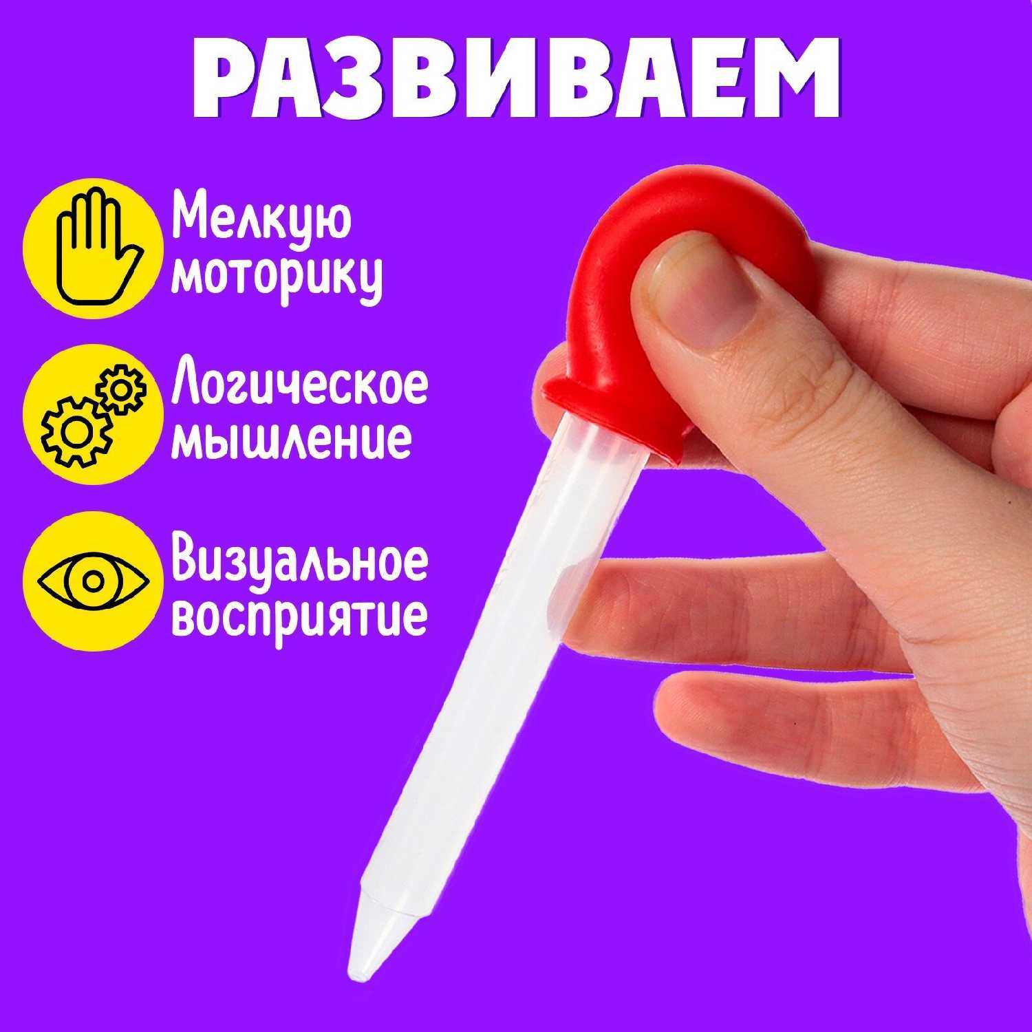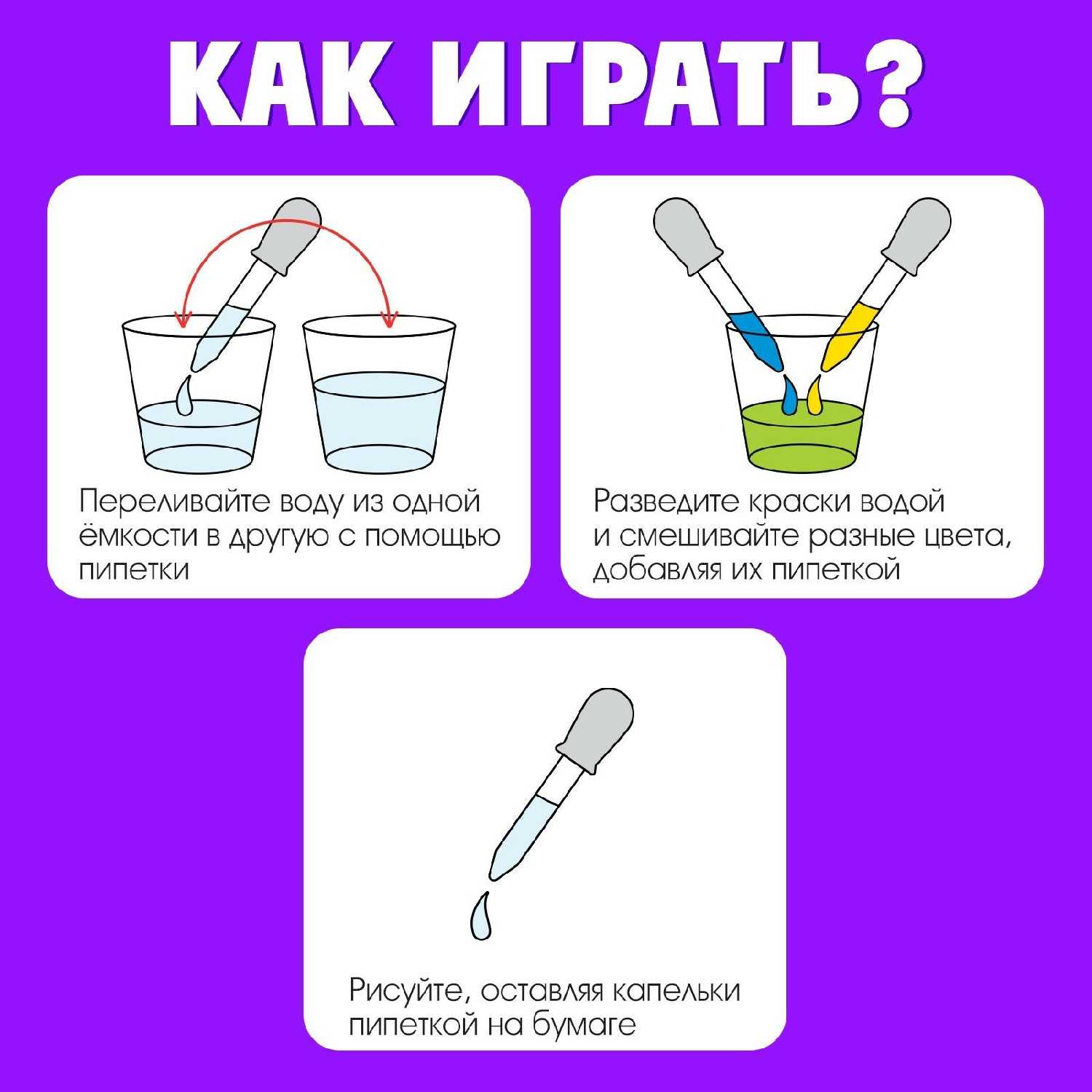 - + Качественные пипетки. Ребенку нравится с ними играть, переливать с их помощью воду из одного стаканчика в другой
