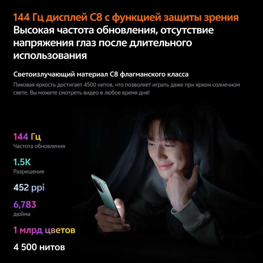 При умеренном использовании (соцсети, звонки, видео) заряда хватает на 1,5–2 дня. В режиме активных игр или съемки видео смартфон работает до вечера. Быстрая зарядка 120W восполняет батарею с 0% до 100% за 50 минут, что удобно для экстренных случаев. -
