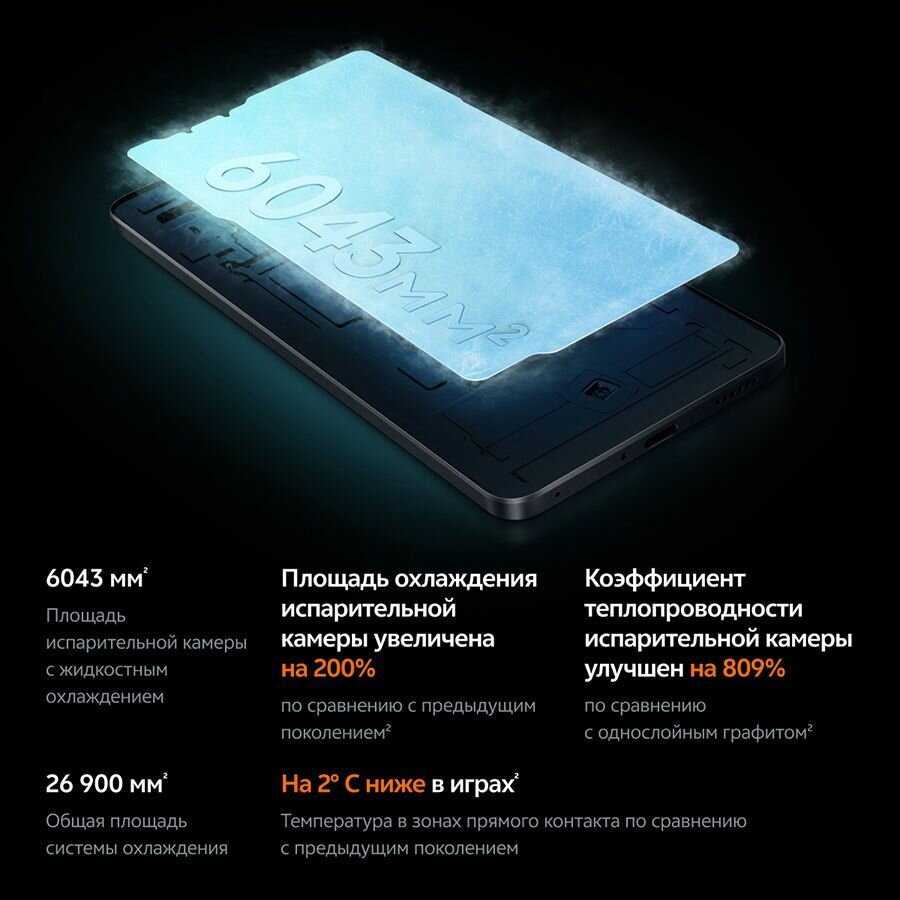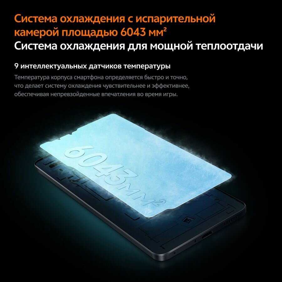 - Многослойная система с графеновыми пластинами и паровой камерой предотвращает перегрев даже после 3-4 часов игр.