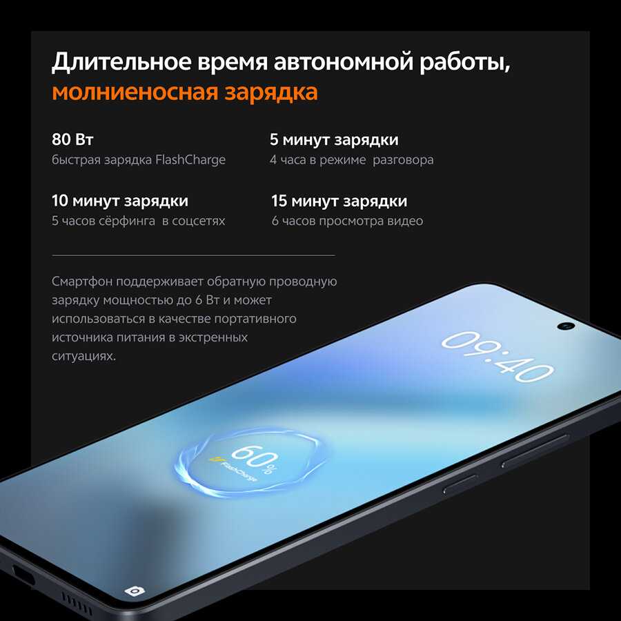 - Технология FlashCharge 120 Вт заряжает устройство с 0% до 100% за 23 минуты, что удобно для активных пользователей.