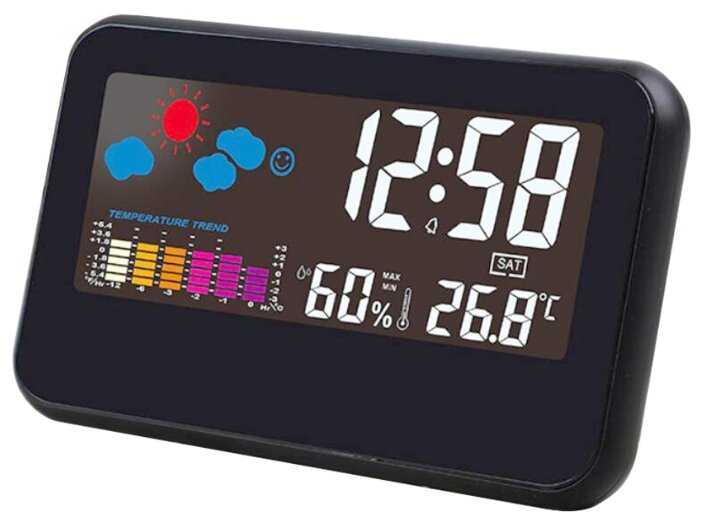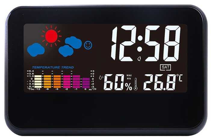 Есть температура, относительная влажность, часы, календарь, будильник.