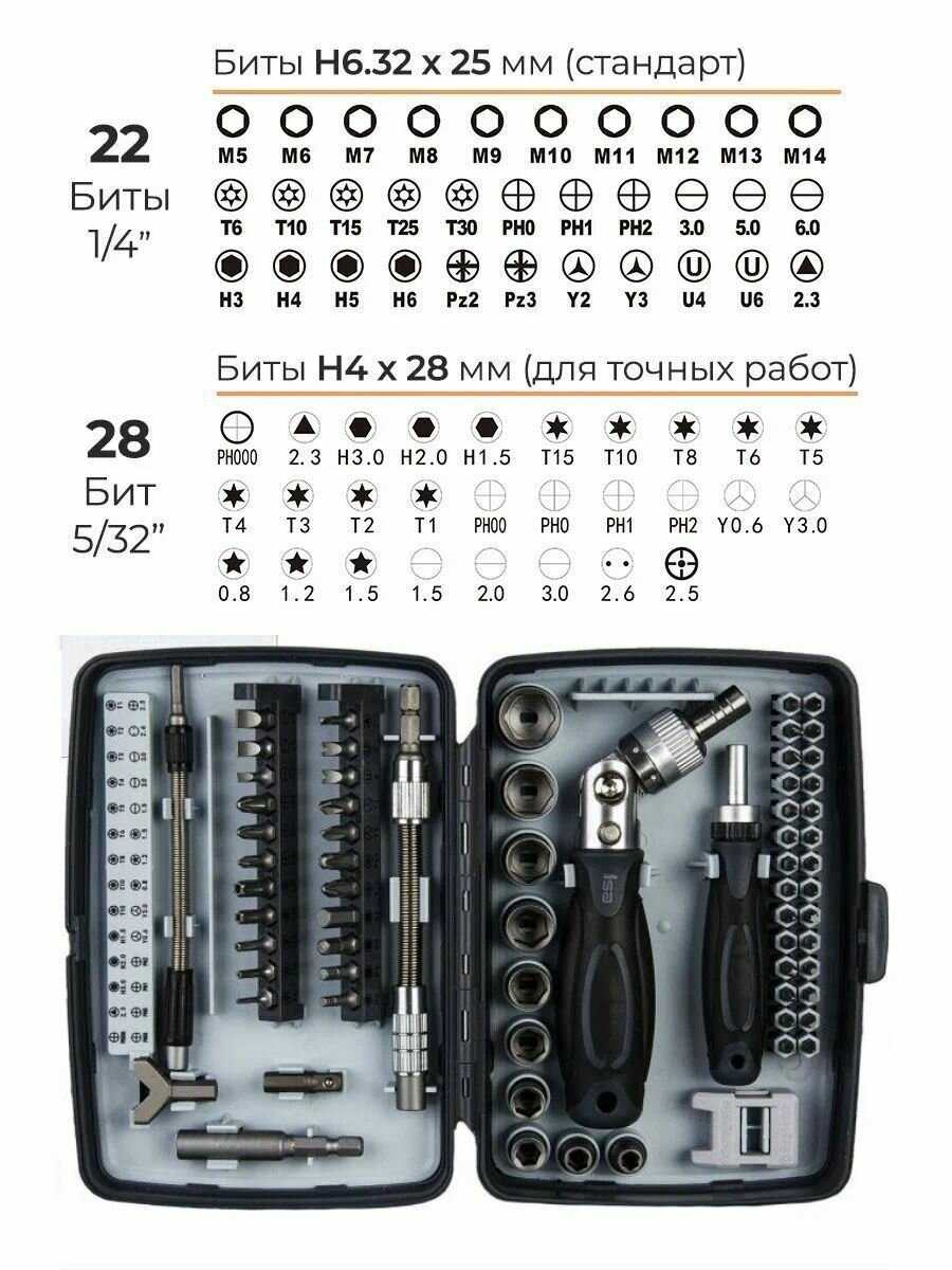 Биты подробно : | H1.5, H2, H3, H4, H5, H6, M5, M6, M10, M8, M12, M14, PH0, PH2, PZ2, PZ3, T10, T20, T25, T30, U2, Y1 |
