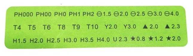 | Шлицы бит : | 12-конечная звёздочка (M/SP), Torx (T/TX), Y-образный (tri-point), pentalobe (ромашка), двухточечный (spanner), крестообразный (PH), прямой (SL), треугольный, трёхлопастной (tri-wing), шестигранный (H/HEX) |