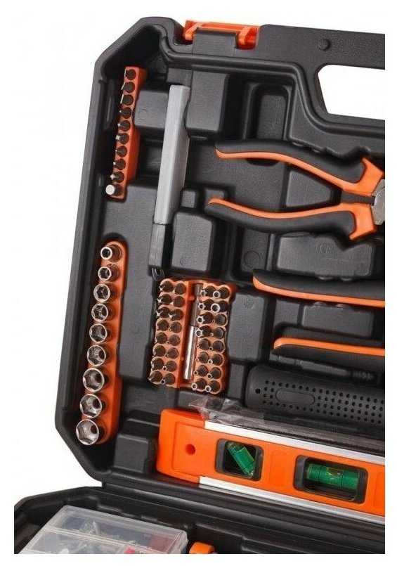 Аксессуары в комплекте : | бита-адаптер для торцевых головок, дюбели, изолента, лезвия для ножа, набор крепежа, нож, отвертка индикаторная, рулетка, уровень |