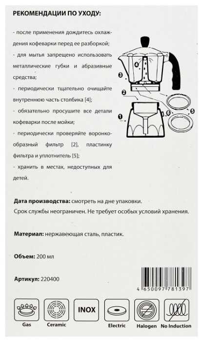 Дополнительная информация : | Тип: гейзерная кофеварка Материал корпуса: сталь Объем: 0.16 л Особенности: теплоизоляционная ручка |