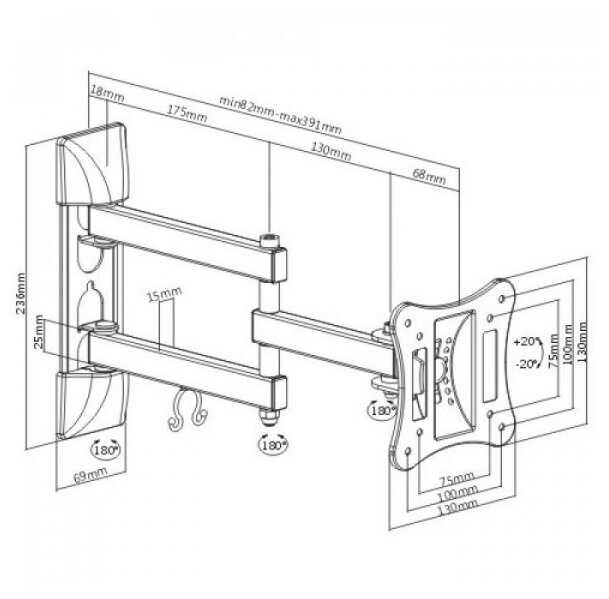 | Дополнительная информация : | наклон: +20°~-20°, поворот: 180°, отступ от стены: 82 - 391 мм, кабель-канал |