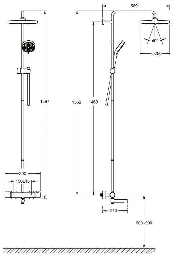 | Дополнительная информация : | размер верхнего душа: 25 см, размер лейки: 9 см, штанга: максимальная высота 1597 мм |