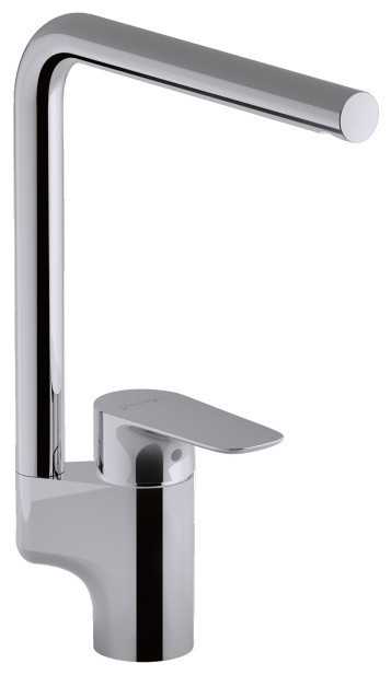 Смеситель интересной формы идеально подошёл нам по дизайну кухни. Сделан на совесть. Крепкая тяжелая латунь. Покрытие корпуса из хрома, потому смотришься супер. Удобная ручка регулировки напора воды, в виде одного рычажка. Вода бежит тихо, практически бесшумно, никуда не брызгает, есть встроенный аэратор. У данного смесителя высокий излив, что в месте с глубокой мойкой очень удобно. Поворачивается излив плавно, без дополнительных усилий, но и не болтается. Объем струи при полном открывании большой, поток воды сильный.