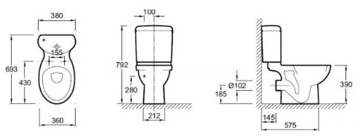 Стандартный унитаз. Удобный и простой. Смывает без брызг и шума. Безободковый, мыть просто. Бочок прилегает плотно, поэтому между чашей и бочком ничего не копится. Размеры стандартные, не громоздкий. Смотрится хорошо. Установка прошла без проблем. Со временем цвет остается таким же белым. никакого налета и сколов нет.
