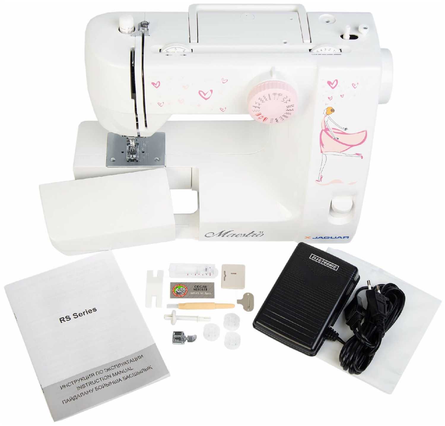 лапка универсальная (установлена на машине), лапка для выполнения петли, лапка для вшивания молнии, лапка для трудных мест Jean Support, штопальная пластина, шпульки 3 шт., набор игл, держатель катушки дополнительный, вспарыватель, отвертка, ножная педаль, мягкий чехол, инструкция по эксплуатации