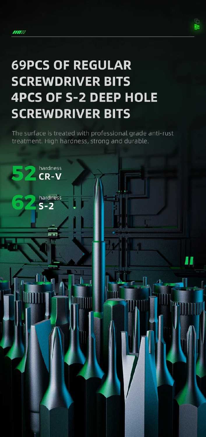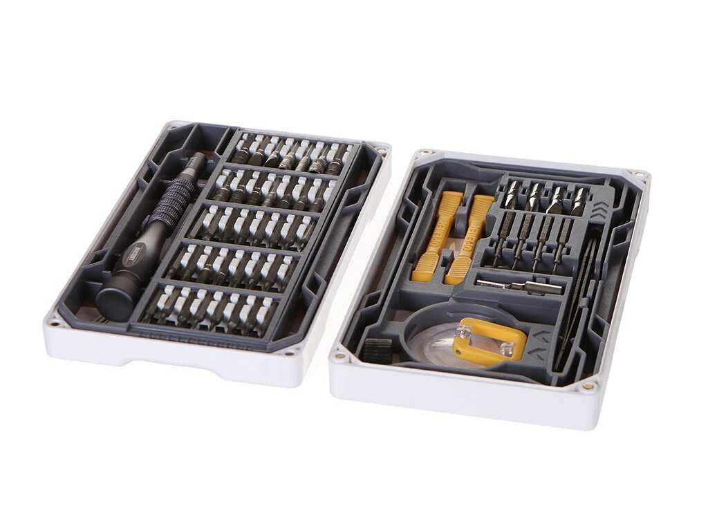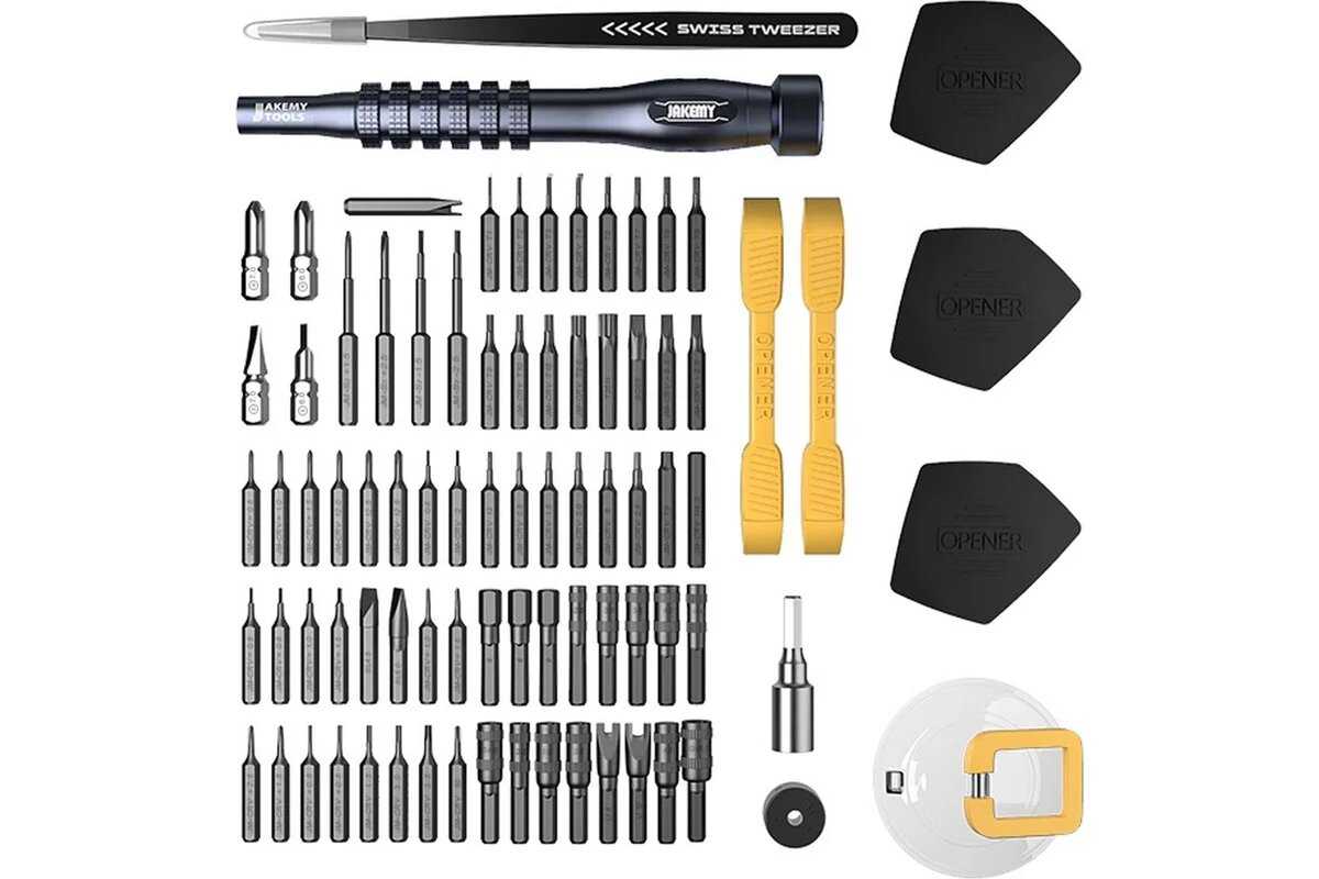 Есть все самые распространенные виды бит, так же сокеты и набор для вскрытия корпусов.