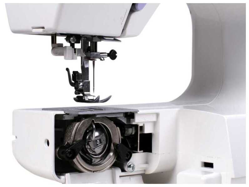 - Боковая съёмная панель обеспечивает прямой доступ к механизму челнока для чистки и смазки.