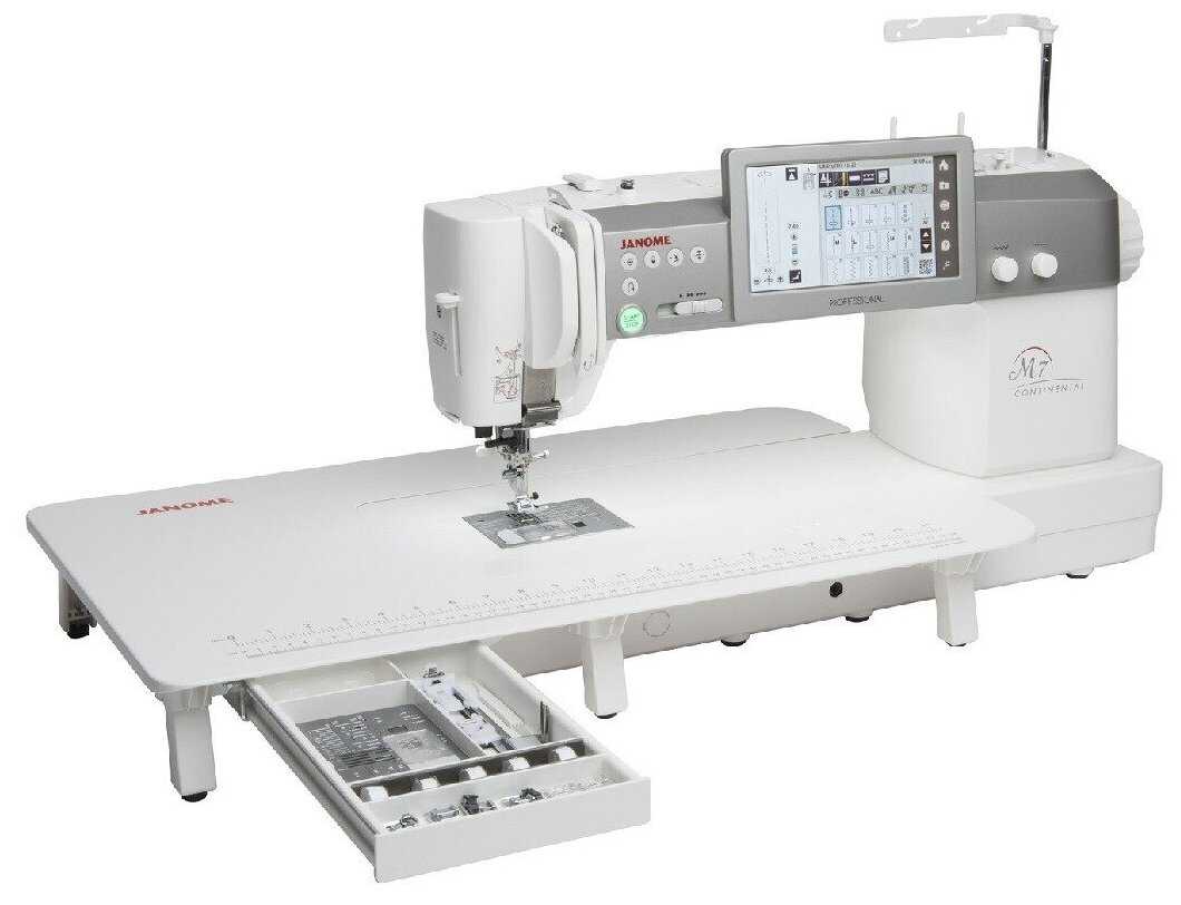 сенсорная панель, подсветка, дисплей, стол для расширения рабочей поверхности, отсек для аксессуаров, нитевдеватель