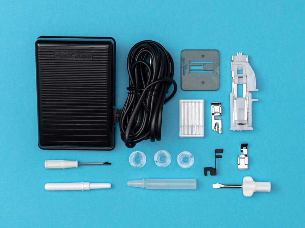 - В комплекте: лапки для молний, подгибки, петли, направляющие, щетка для чистки челнока, что экономит время на поиск аксессуаров.