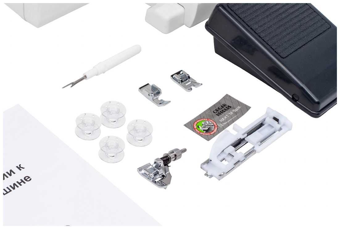 Швейная машина, лапка универсальная, лапка для петли-автомат, лапка для пришивании молнии, лапка для потайной строчки, лапка для атласных строчек, набор стандартных игл, шпульки 4 шт., вспарыватель для прорезания петли, руководство по эксплуатации, педаль электрическая