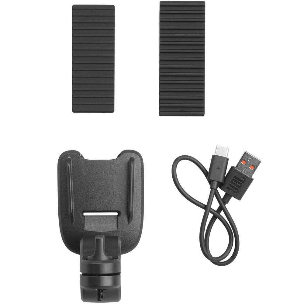В комплекте есть крепление на руль, карабин для переноски, резиновые прокладки для фиксации и USB-кабель (тип micro-USB). Зарядное устройство отсутствует — требуется подключение к адаптеру или powerbank.