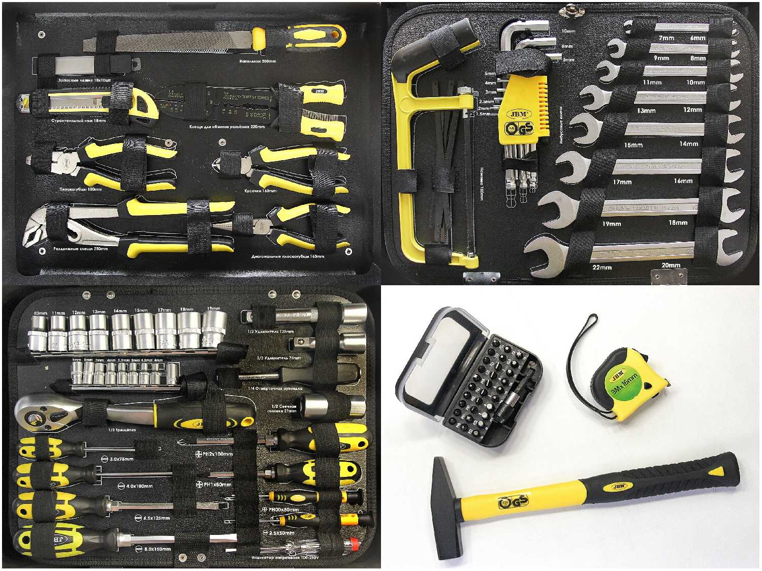 Инструменты в комплекте : | бокорезы, вороток для головок, длинногубцы, клещи, клещи для обжима проводов, клещи переставные, ключи гаечные, ключи имбусовые (шестигранные), кусачки, молоток, напильник по металлу, ножовка по металлу, отвёртки, пассатижи, плоскогубцы, рукоять для бит, рукоять для головок, трещотка |