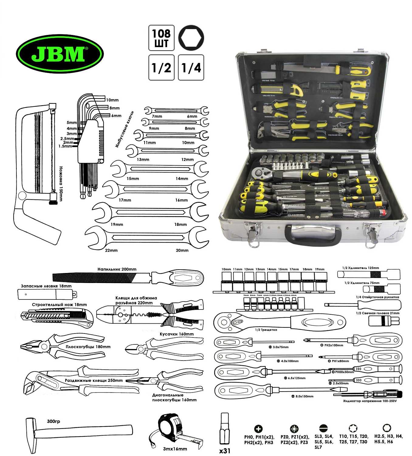 Лучшие цены сегодня на JBM Кейс алюминиевый с инструментом 108шт 1/2"