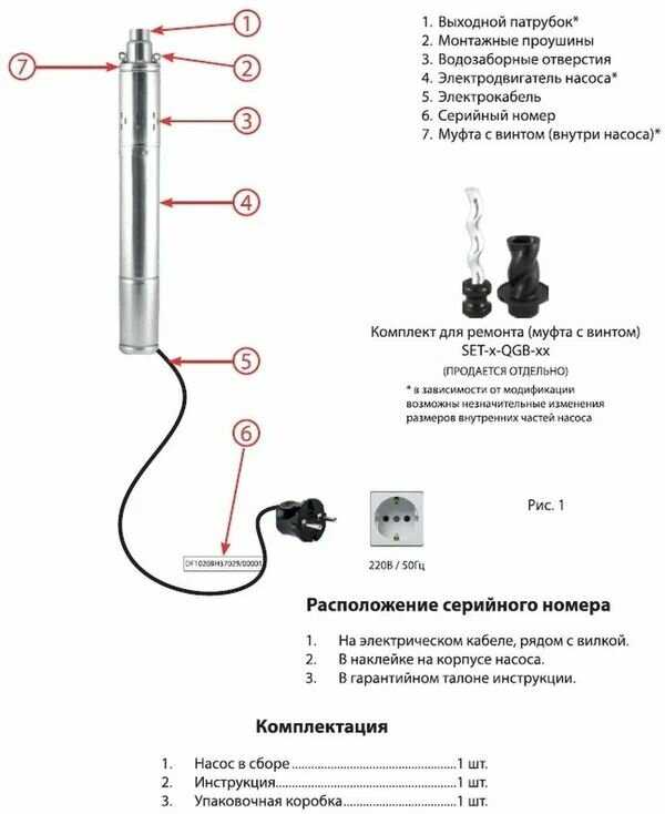 Подробная комплектация : | Винтовой колодезный насос с поплавковым выключателем, кабель 25 м, инструкция, упаковка |