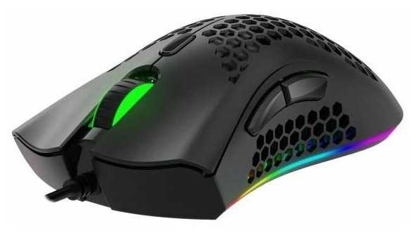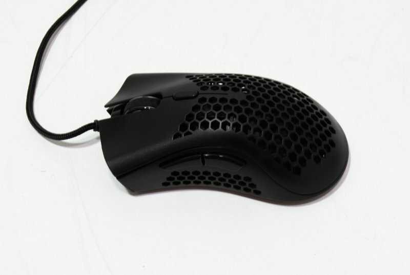 Эргономичная форма обеспечивает комфортный хват, а прорезиненные боковины предотвращают скольжение, хотя их накладки могут отслаиваться. Вес мыши оценивается как минимальный, что удобно для динамичных игр, но при этом перфорированный корпус активно собирает пыль и уязвим к попаданию жидкостей. Тактильно поверхность имитирует премиальные материалы, но пластик со временем покрывается царапинами. -