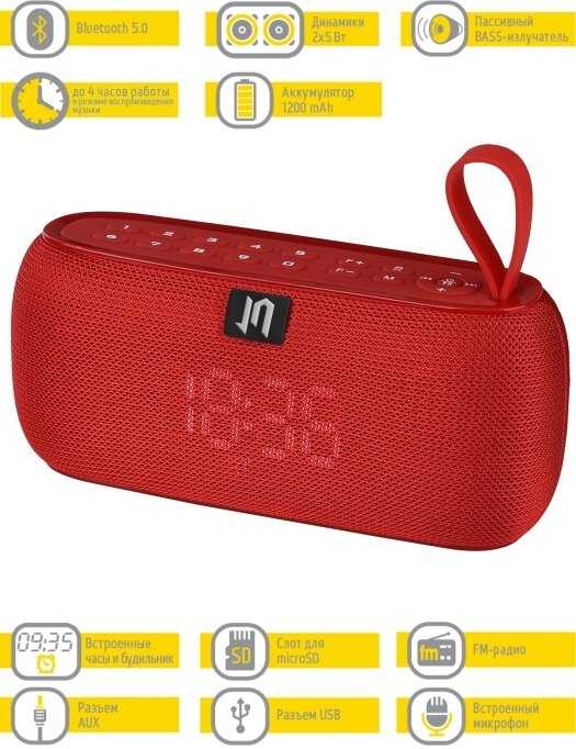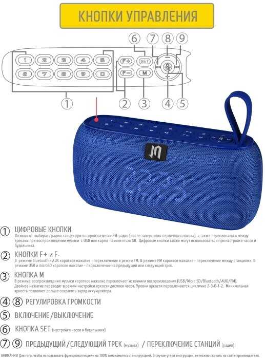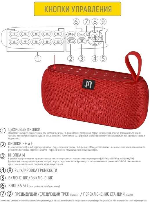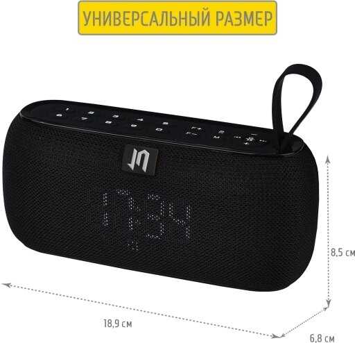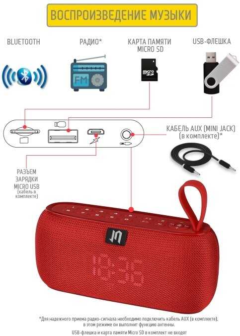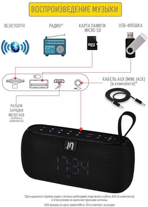 - + Отличная любительская колонка. Звук в меру громкий. Для помещения отлично. Можно вставить флэшку, телефон через провод, использовать радио или по блютусу подключиться. Когда зарядка заканчивается, то она женским голосом озвучивает «колонка разряжена» , вставляю шнур и снова наслаждаюсь музыкой.