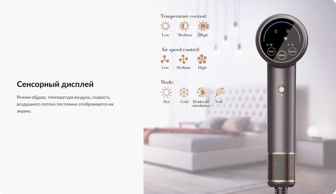- + С помощью дисплея легче управлять феном, а также активировать особый «эко» режим, благодаря которому значительно уменьшит расход энергии.