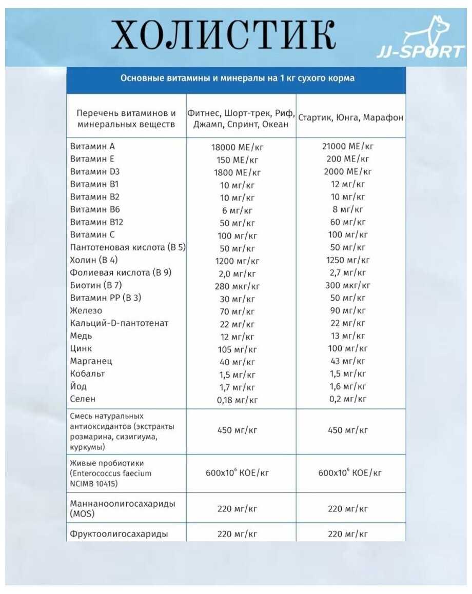 | Витамины : | витамин А: 30000 МЕ Калий: 1, 35 г Витамин D3: 1000 МЕ Магний: 250 мг Витамин E: 120 МЕ Натрий: 240 мг Витамин В1: 5 мг Сера: 630 мг Витамин В2: 5, 2 мг Железо: 150 мг Витамин В4: 200 мг Йод: 1, 2 мг Витамин В6: 3 мг Медь: 1, 0 мг Витамин В12: 100 мкг Марганец: 10 мг Биотин: 200 мкг |