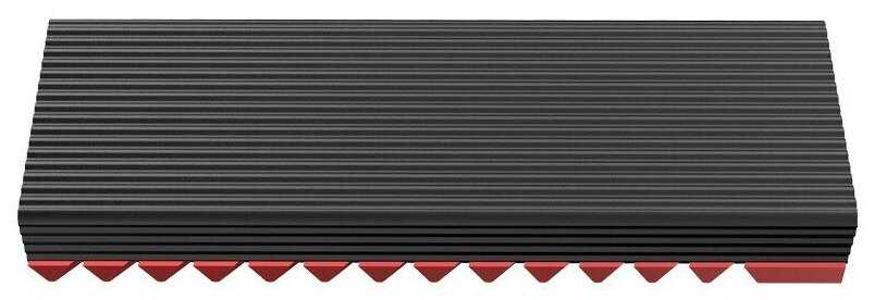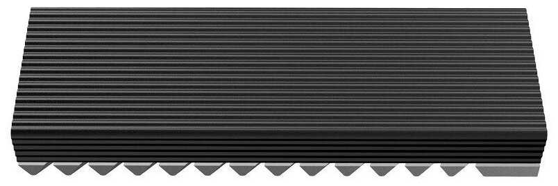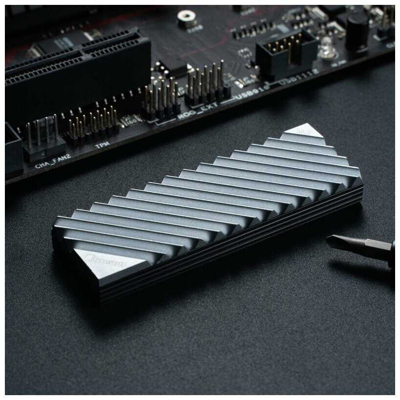 Конструкция представляет собой массивный алюминиевый блок с развитым оребрением, обеспечивающий большую площадь теплообмена. Ключевая особенность – комплектация четырьмя термопрокладками двух толщин (толстые белые 1 мм и тонкие черные 0.5 мм), позволяющая адаптировать радиатор под SSD с разной высотой чипов. Однако для толстых накопителей (особенно с чипами на обеих сторонах платы, как Samsung 990 Pro) даже тонкие прокладки могут препятствовать закрытию крышки. Механизм фиксации типа "салазки" вызывает нарекания: верхняя часть не всегда плотно прилегает, возможен перекос, а при демонтаже SSD "приклеивается" к прокладкам, требуя аккуратного поддевания.