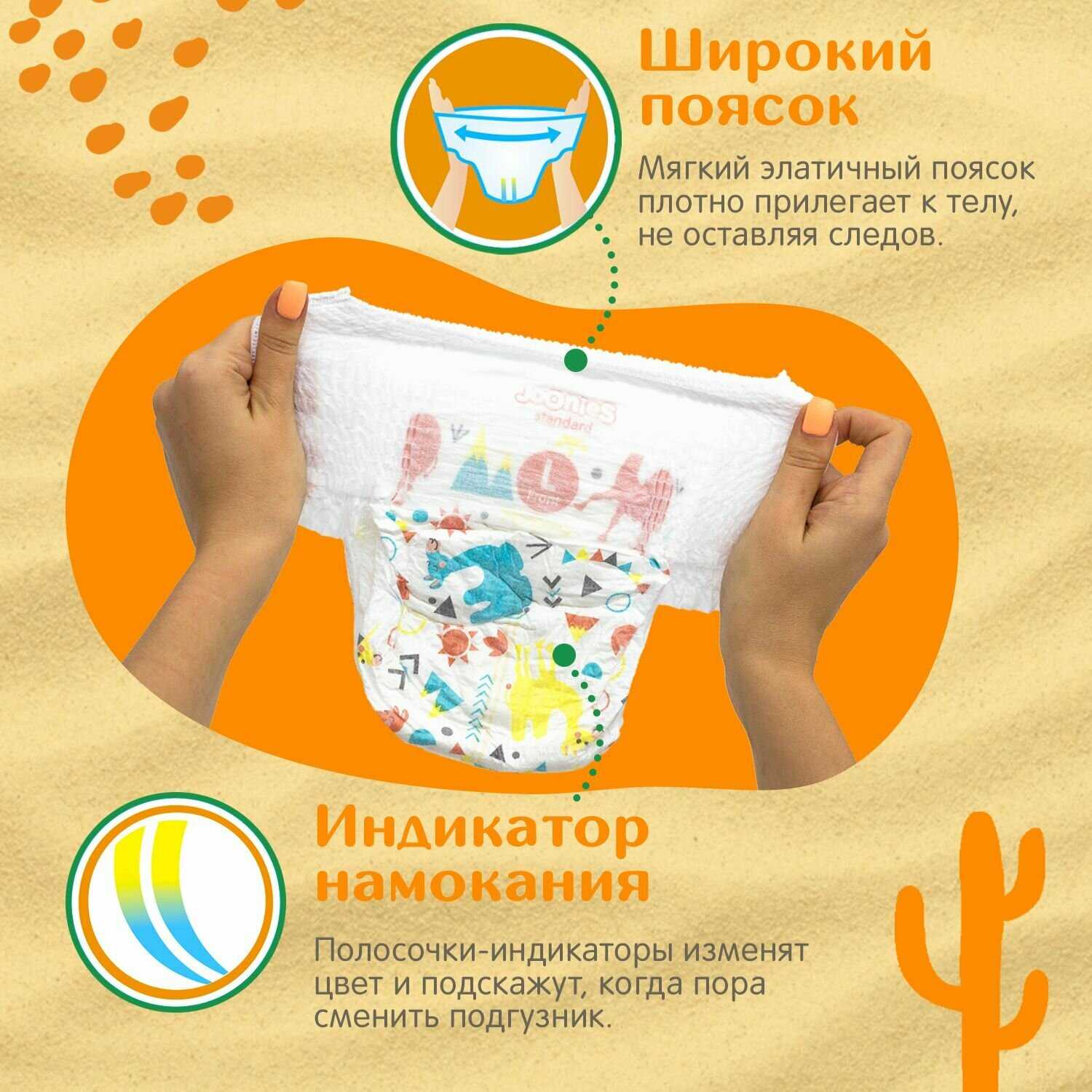 Подгузники Joonies Standard выполнены из дышащих материалов, что особенно ценится летом. Внутренний слой мягкий, но чуть грубее, чем у Premium-версии. Многие отмечают, что даже при полном намокании внешний слой остаётся сухим на ощупь, что снижает риск пропитывания одежды. Однако при переполнении влага может выступать на поверхность, создавая эффект «мокрой плёнки». Для детей весом 9–14 кг подгузники сидят плотно, не сползают во время активных игр, но для малышей с крупными бёдрами рекомендуется брать размер с запасом. Отсутствие химического запаха и раздражающих компонентов делает их безопасными для длительного дневного ношения.