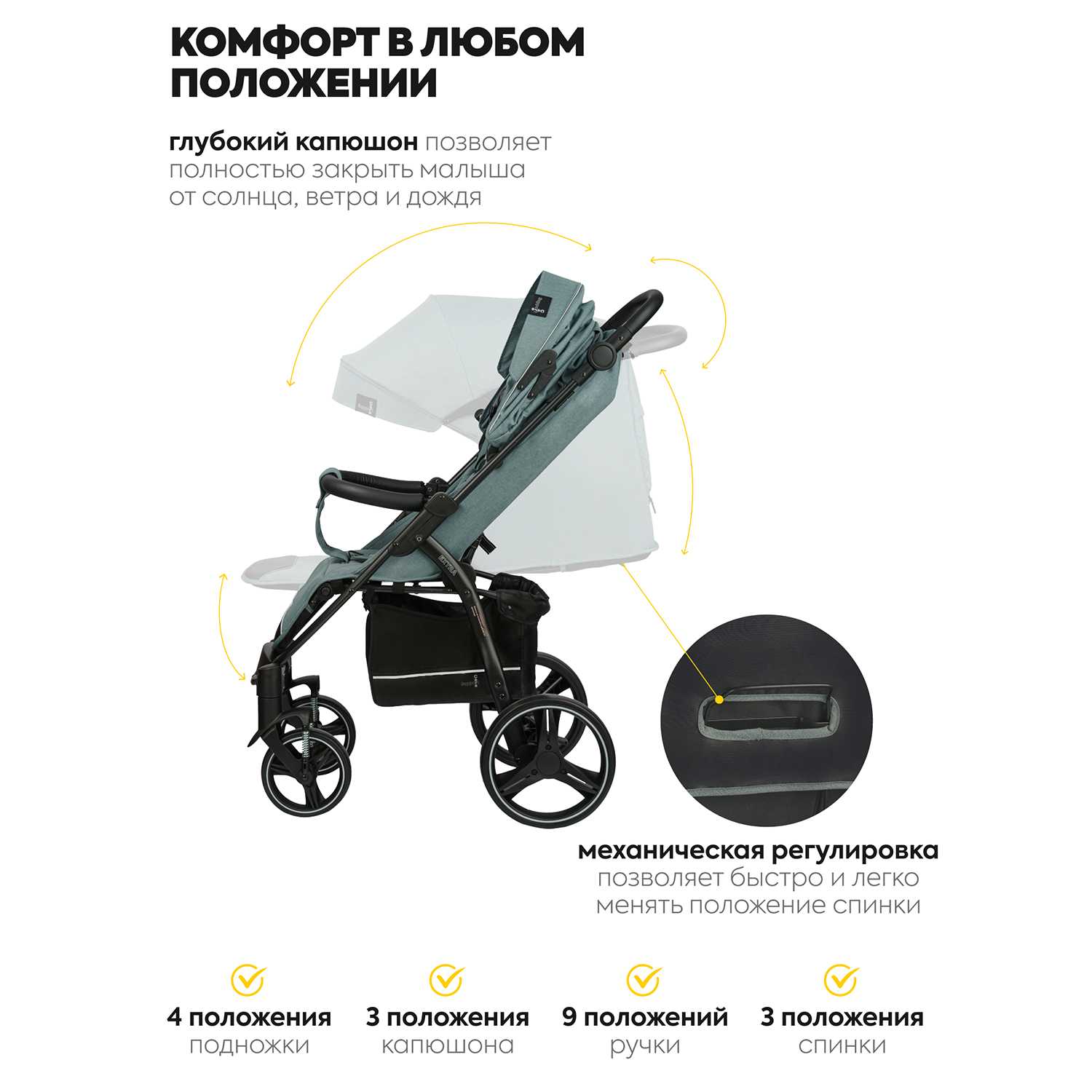| Особенности капюшона : | вентиляция, капюшон опускается до бампера, материал с УФ-защитой, смотровое окно |