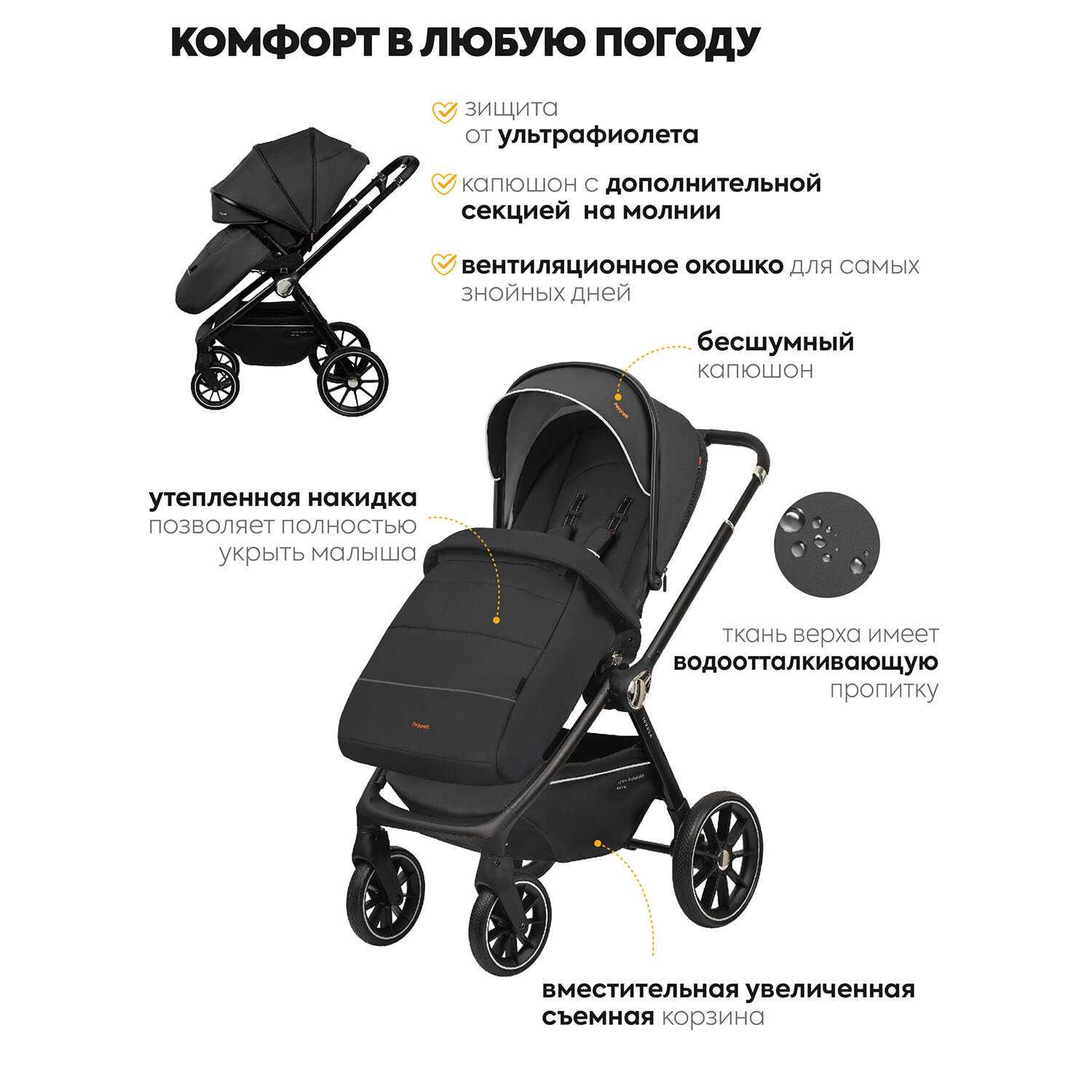 В комплекте нет дождевика, но козырек в разложенном виде пока справлялся с мокрым снегом. На ребенка не попадало ничего.