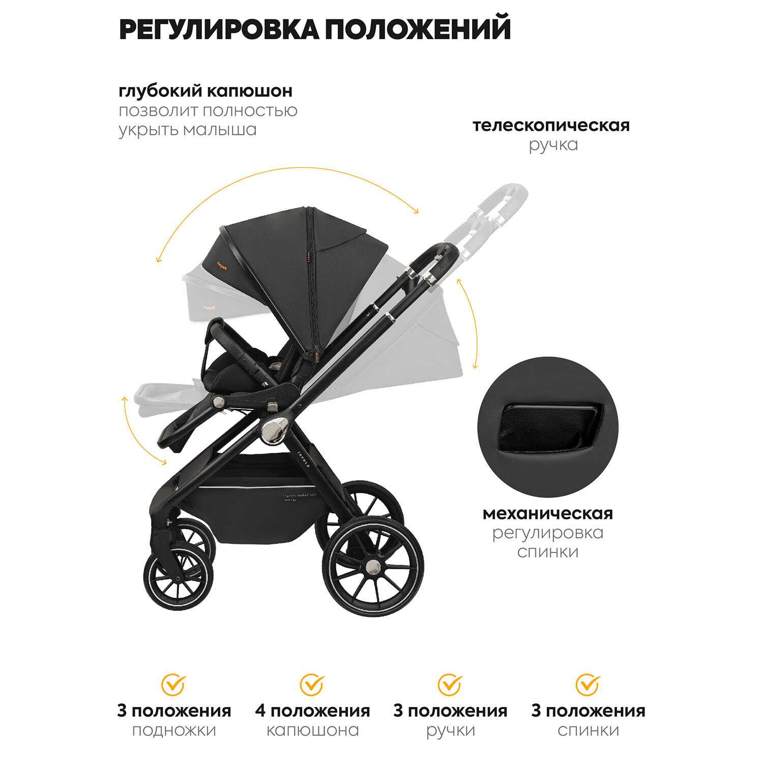- - Ручка коляски не регулируется к сожалению, находится в одном положении