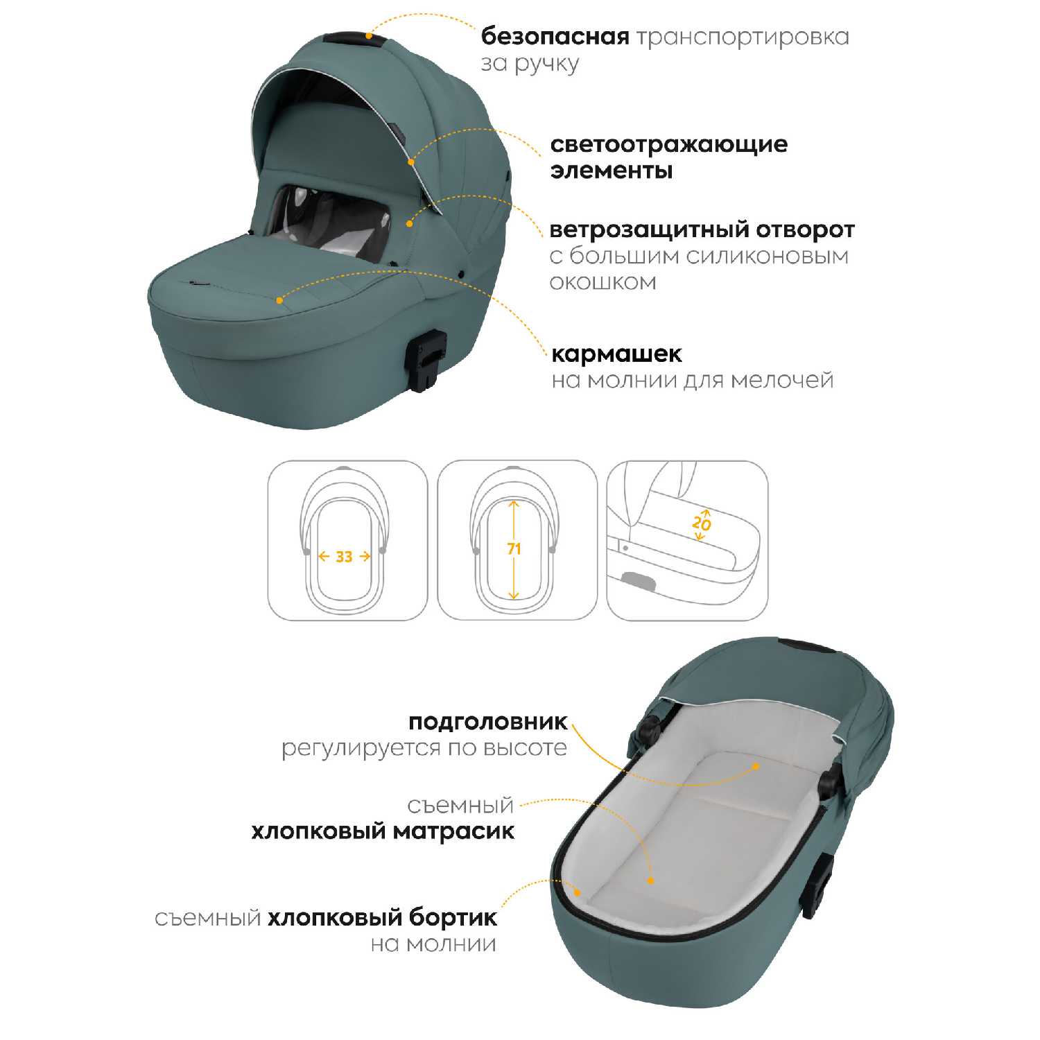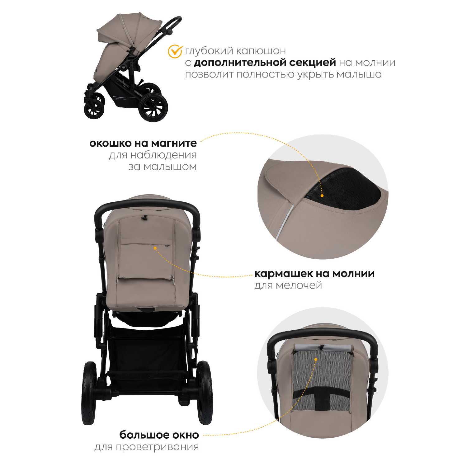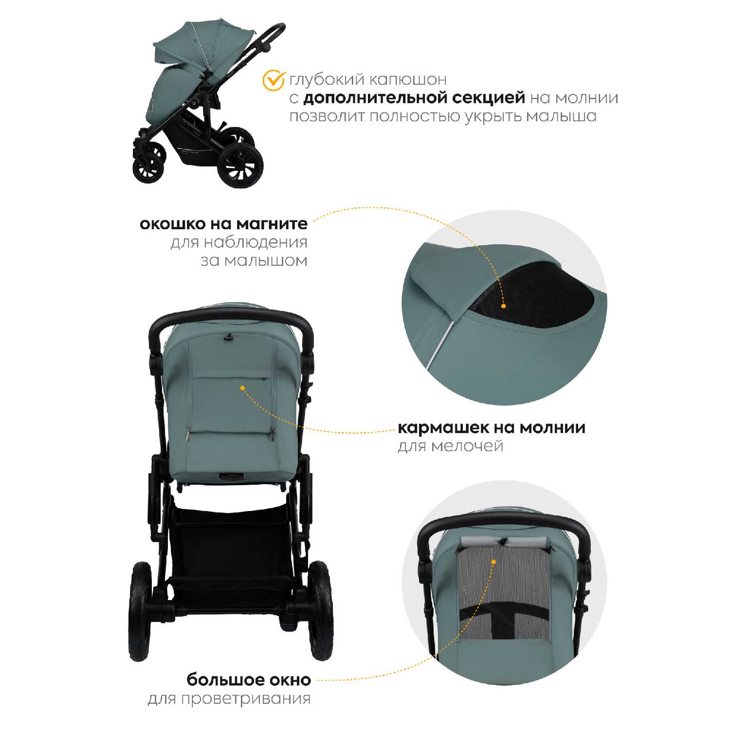 - Солнцезащитный капюшон с UPF 50+ и смотровым окном из сетки обеспечивает контроль за ребёнком без открытия люльки.