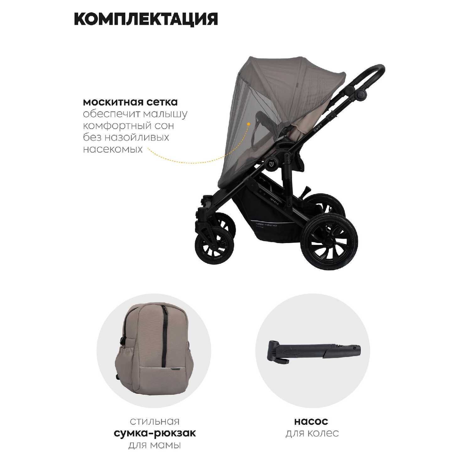 В базовой комплектации отсутствуют дождевик и дополнительный матрасик, которые необходимо приобретать отдельно. Москитная сетка и насос для колёс обычно включены в поставку. Рекомендуется заранее уточнять комплектацию, так как набор аксессуаров может варьироваться в зависимости от партии. -